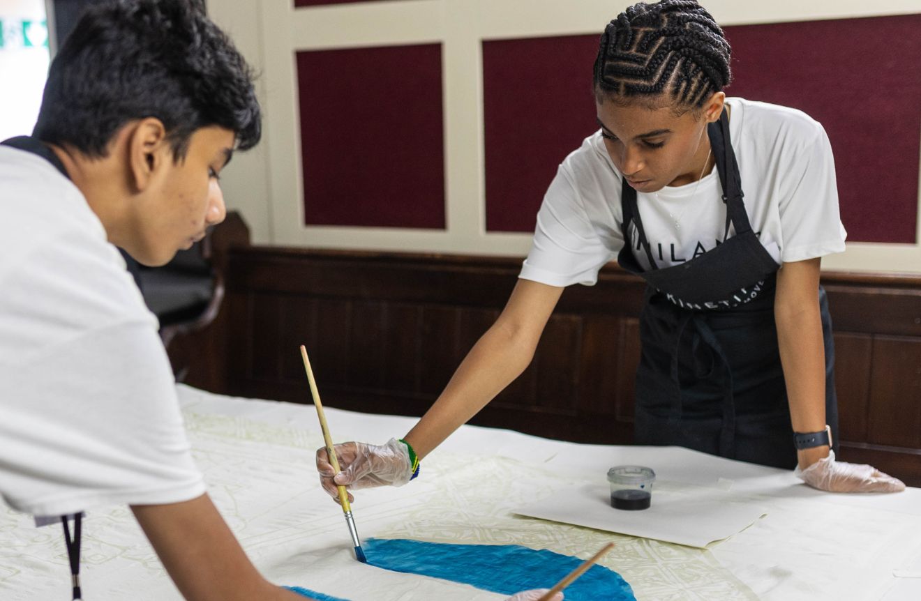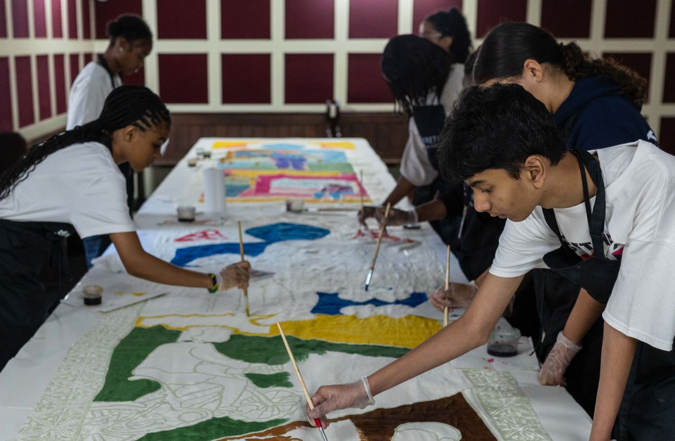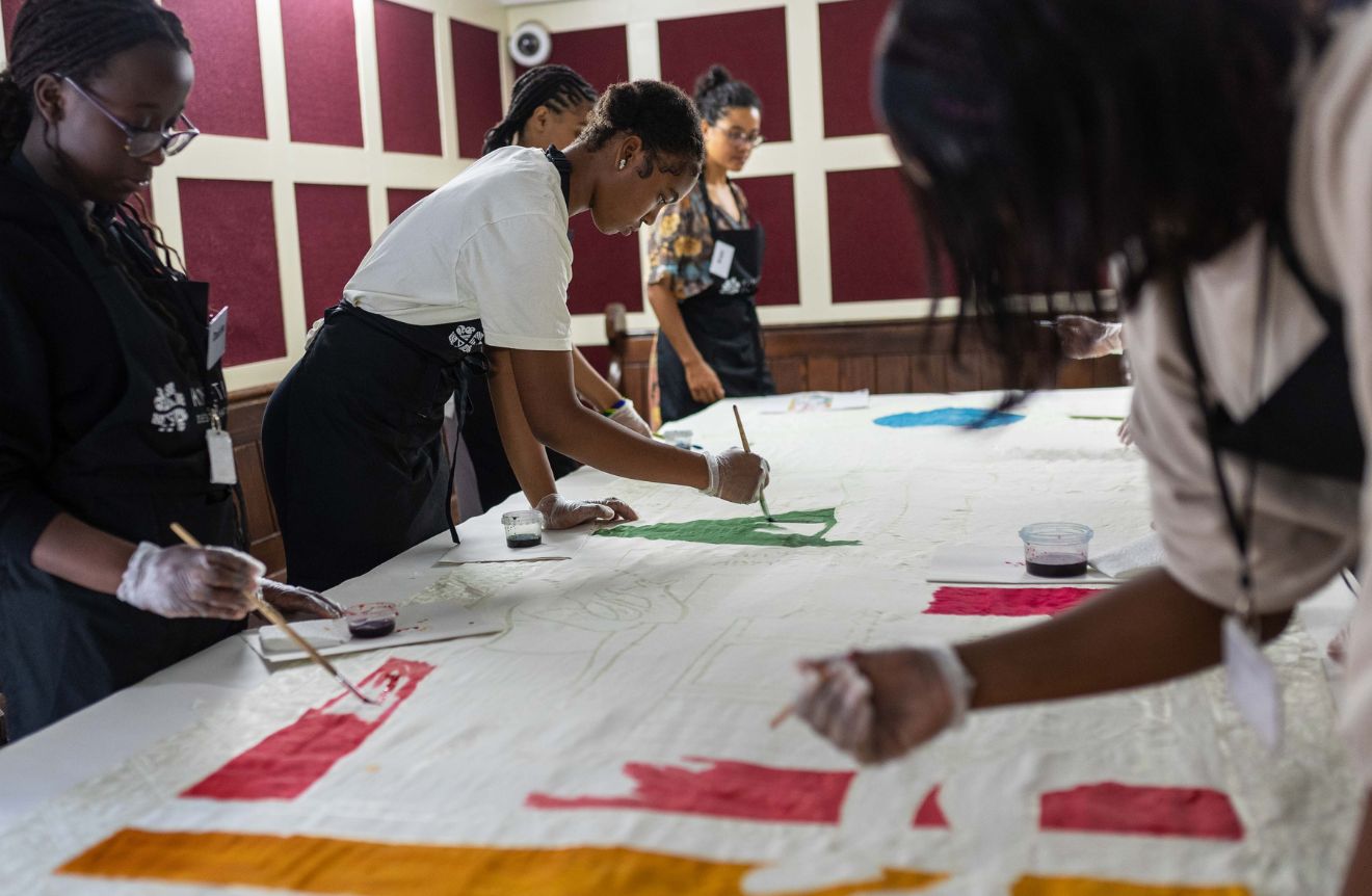 Kinetika played a central role by collaborating with the young participants to create a series of large-scale hand-painted silk banners that visually wove their stories into the historical narrative of Cumberland Lodge. Guided by Kinetika’s artists, the group transformed personal photographs and self-portraits that resonated with their sense of home and belonging – captured during a creative session within the Lodge – into vibrant, colourful silk designs using the traditional batik technique.
