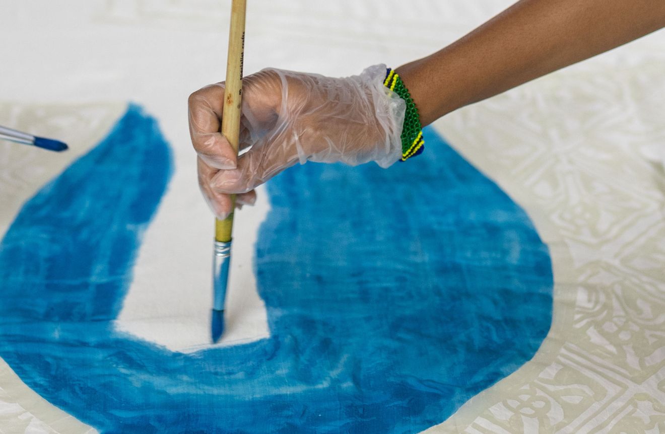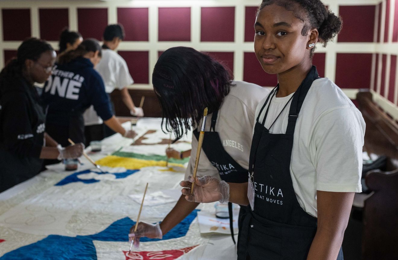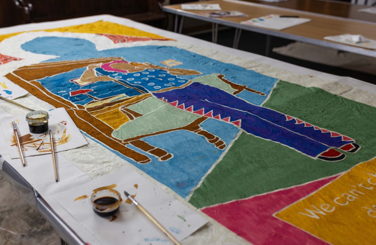 Kinetika played a central role by collaborating with the young participants to create a series of large-scale hand-painted silk banners that visually wove their stories into the historical narrative of Cumberland Lodge. Guided by Kinetika’s artists, the group transformed personal photographs and self-portraits that resonated with their sense of home and belonging – captured during a creative session within the Lodge – into vibrant, colourful silk designs using the traditional batik technique.