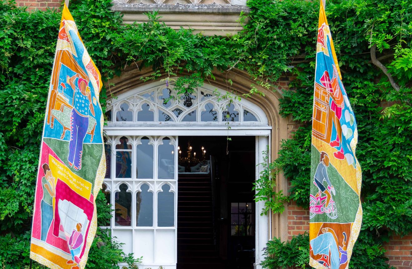 This hands-on process enabled the young people to connect deeply with both their own stories and the heritage of the place, creating a meaningful dialogue between past and present. The banners are a visual testament to the voices of a new generation, proudly contributing their perspectives to the historic walls of Cumberland Lodge.