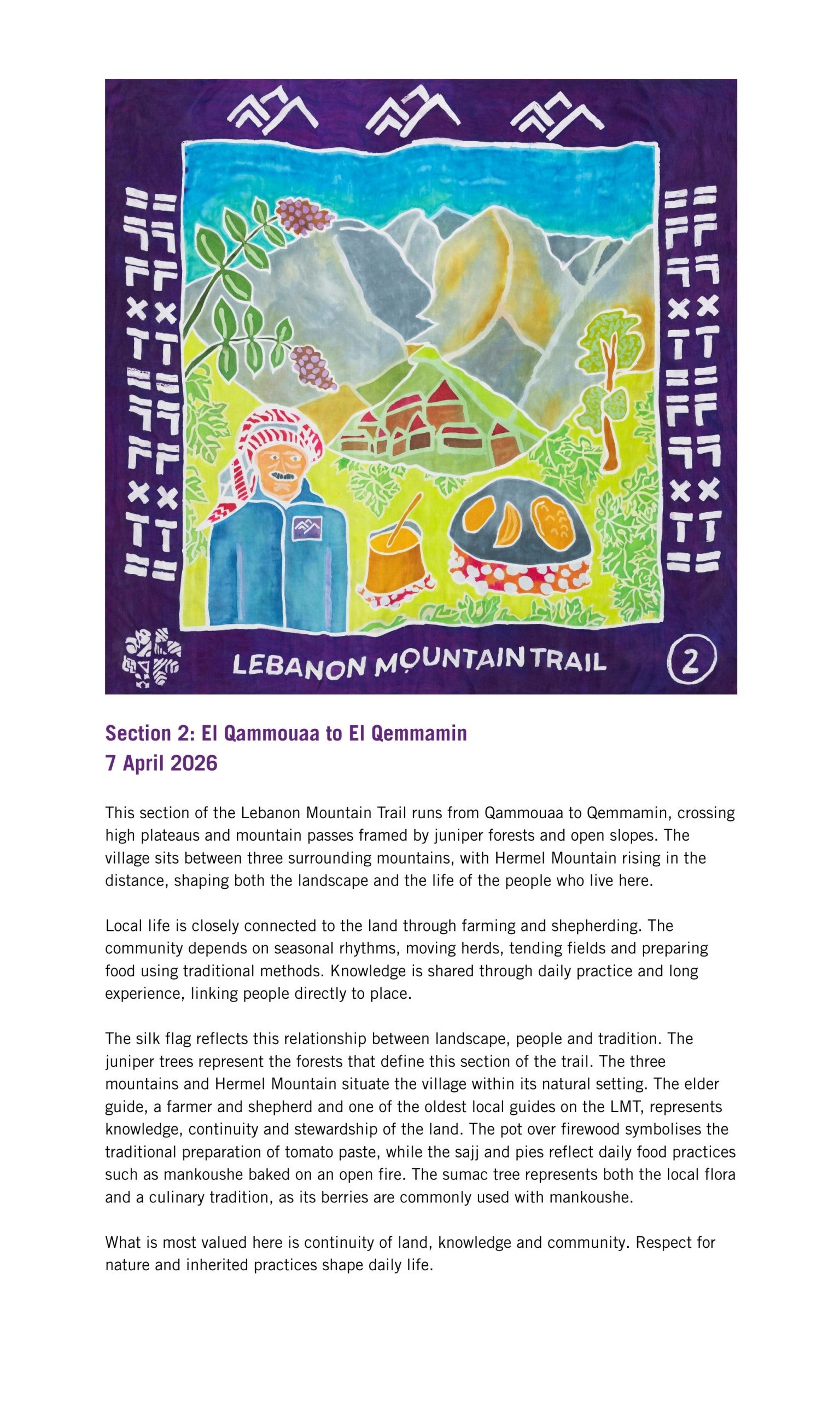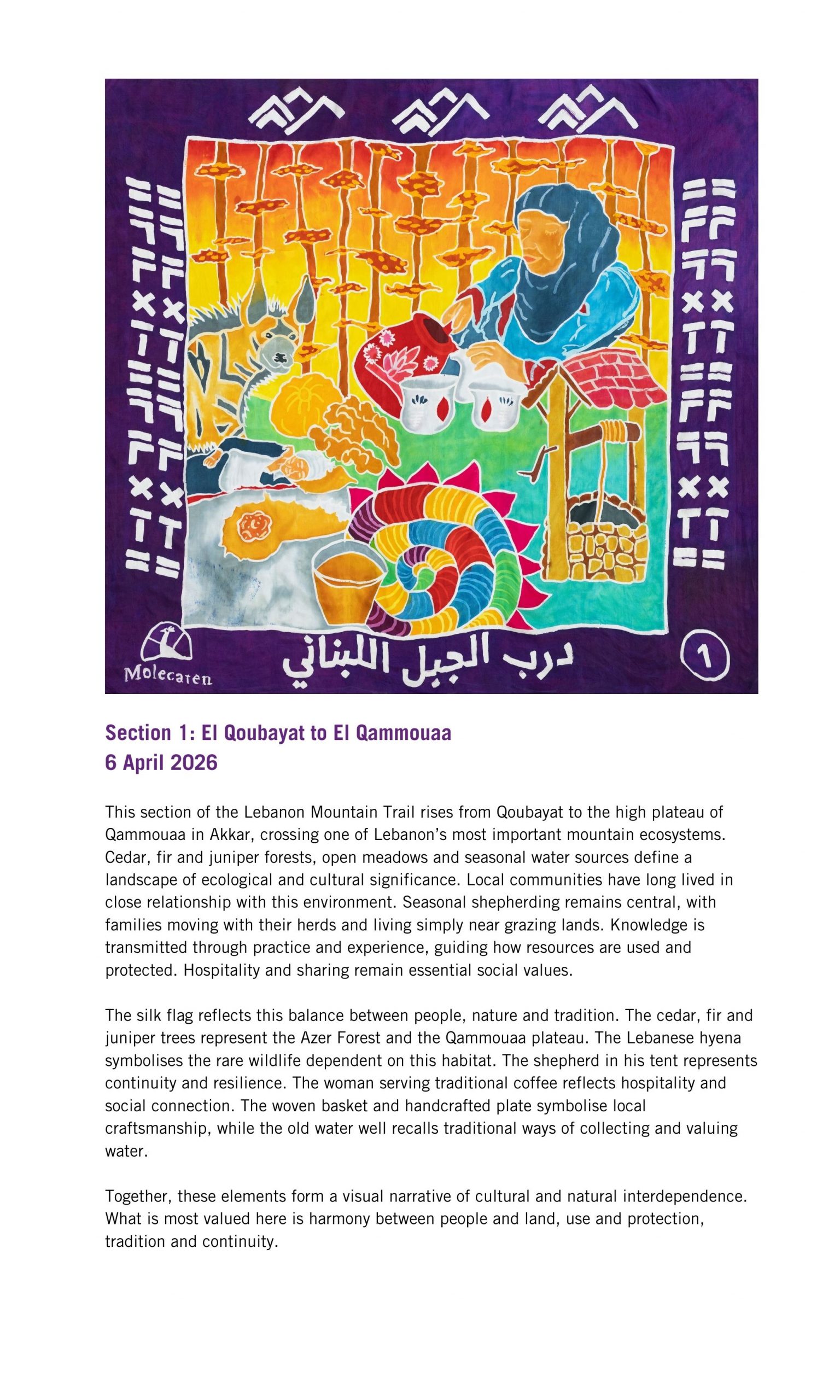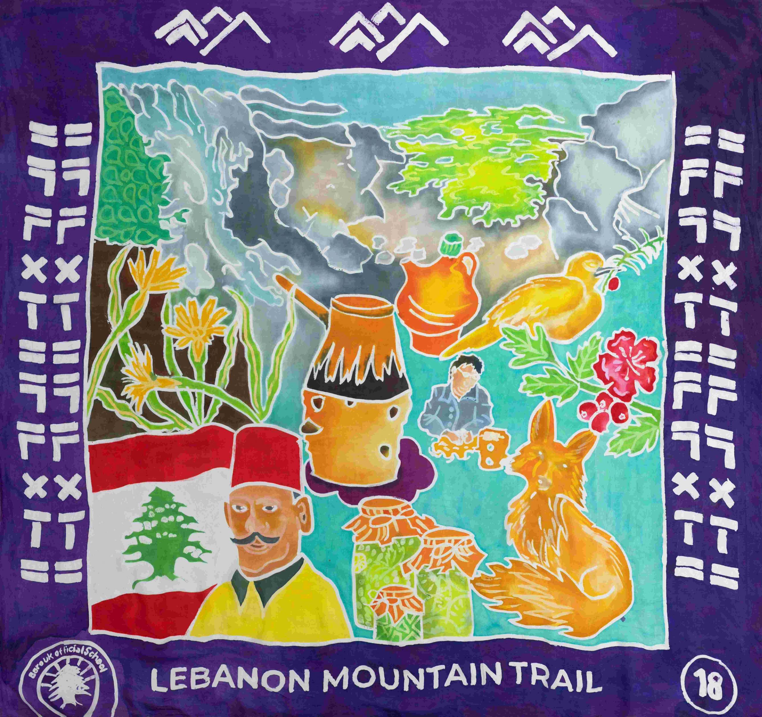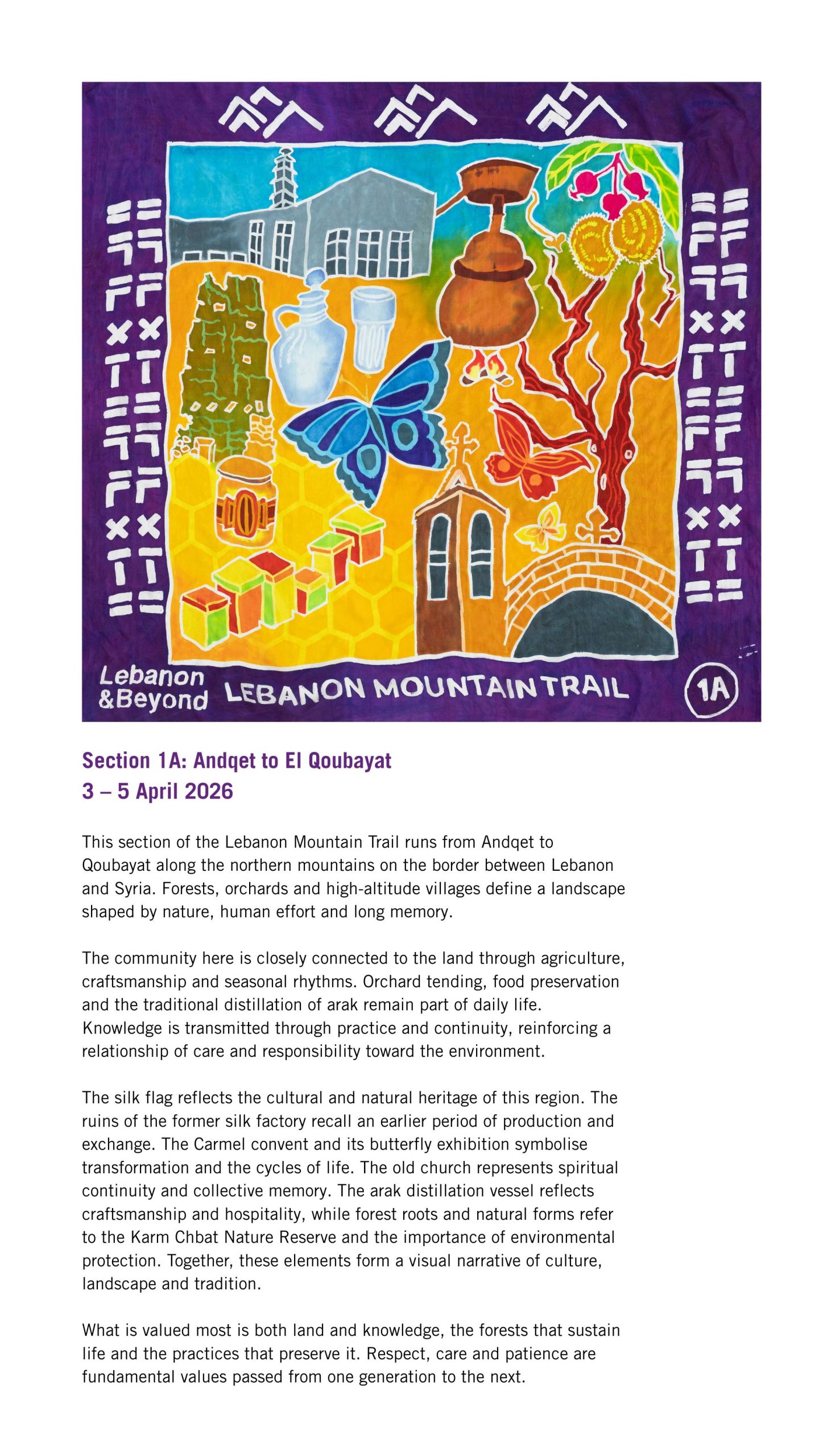 The Lebanon Mountain Trail winds through more than 80 villages and towns, connecting people, places and stories across 450 kilometres of terrain, with an additional 150 kilometres of side network trails to explore. From ancient cedar groves and sacred valleys to wildflower meadows and mountain peaks, it is a route rich in biodiversity, history and culture. Kinetika worked in collaboration with the Lebanon Mountain Trail Association (LMTA) to bring these stories to life in a new way, through the design and creation of illustrated silk flags.