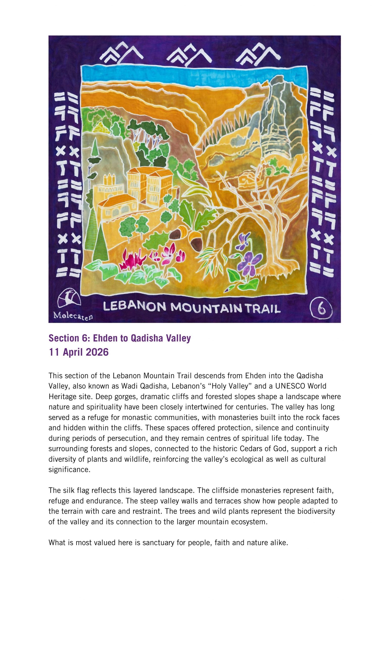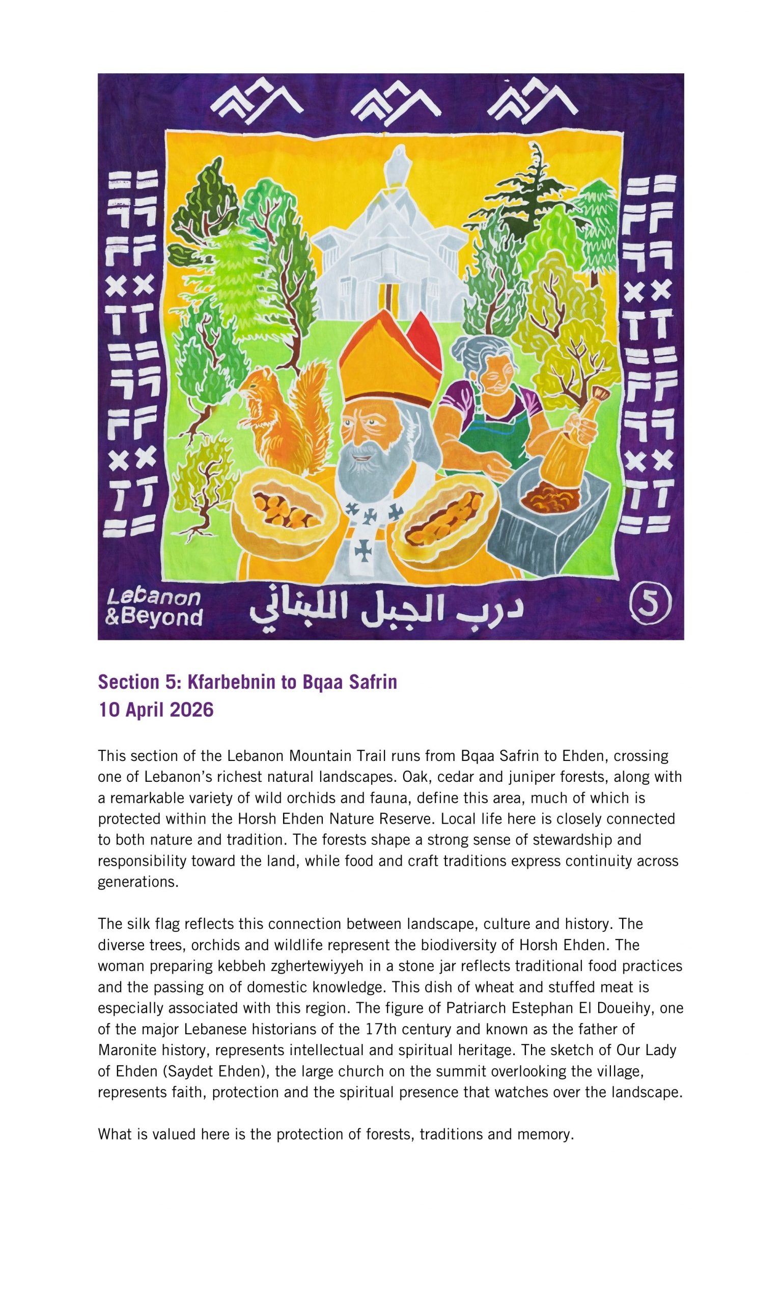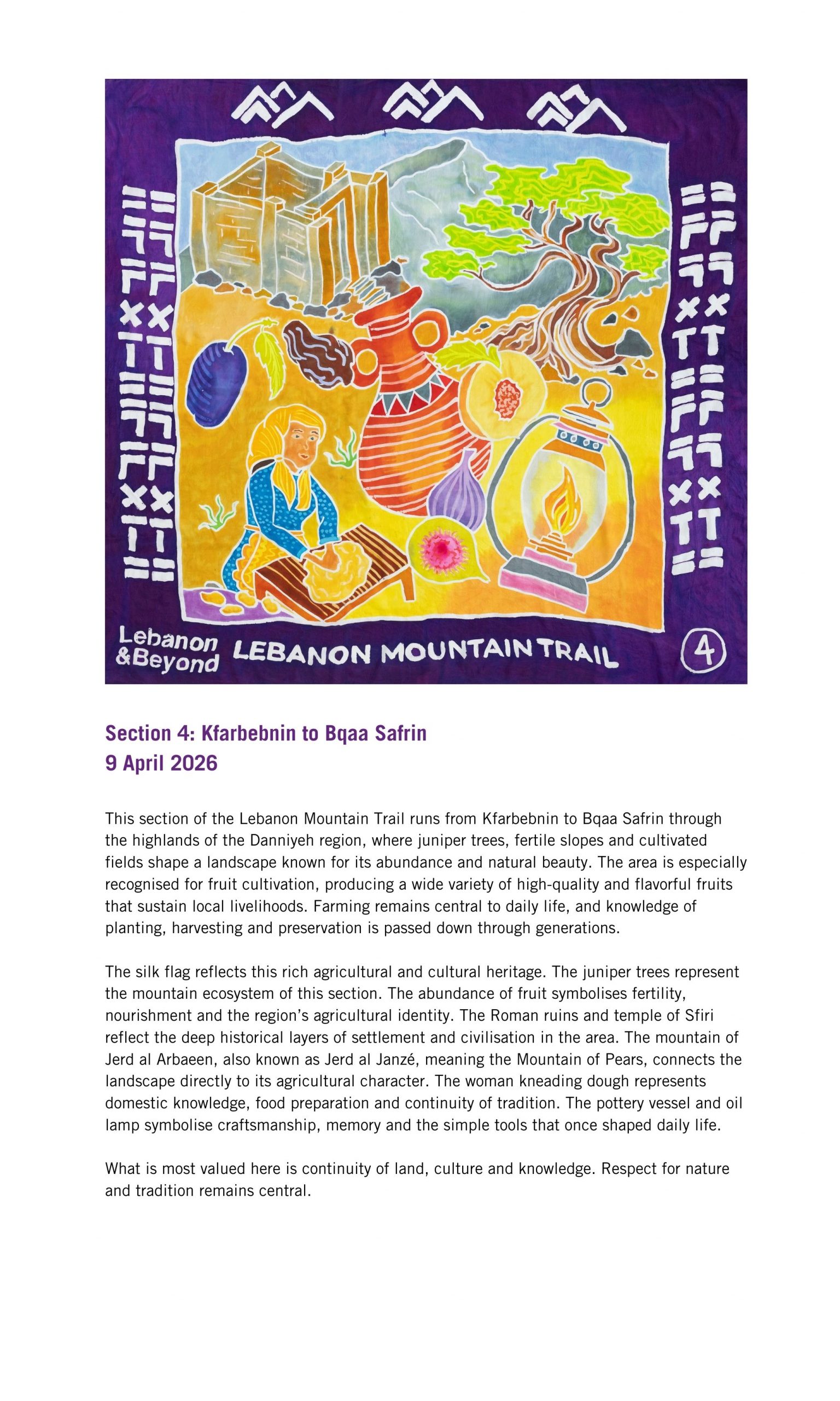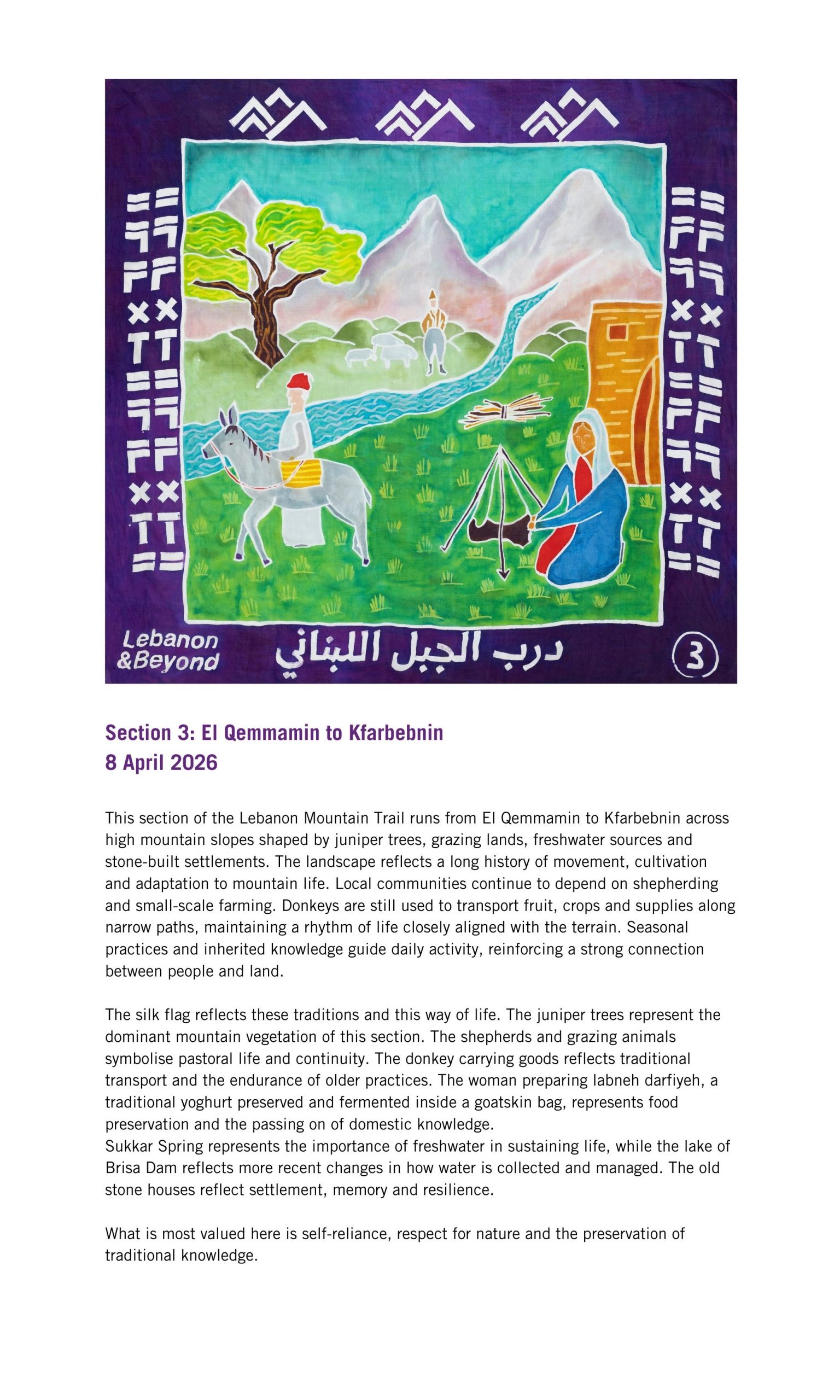 The Lebanon Mountain Trail winds through more than 80 villages and towns, connecting people, places and stories across 450 kilometres of terrain, with an additional 150 kilometres of side network trails to explore. From ancient cedar groves and sacred valleys to wildflower meadows and mountain peaks, it is a route rich in biodiversity, history and culture. Kinetika worked in collaboration with the Lebanon Mountain Trail Association (LMTA) to bring these stories to life in a new way, through the design and creation of illustrated silk flags.