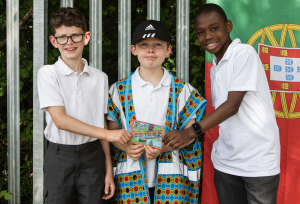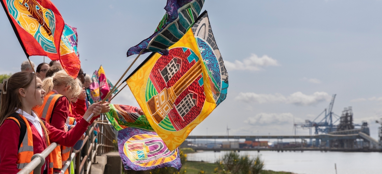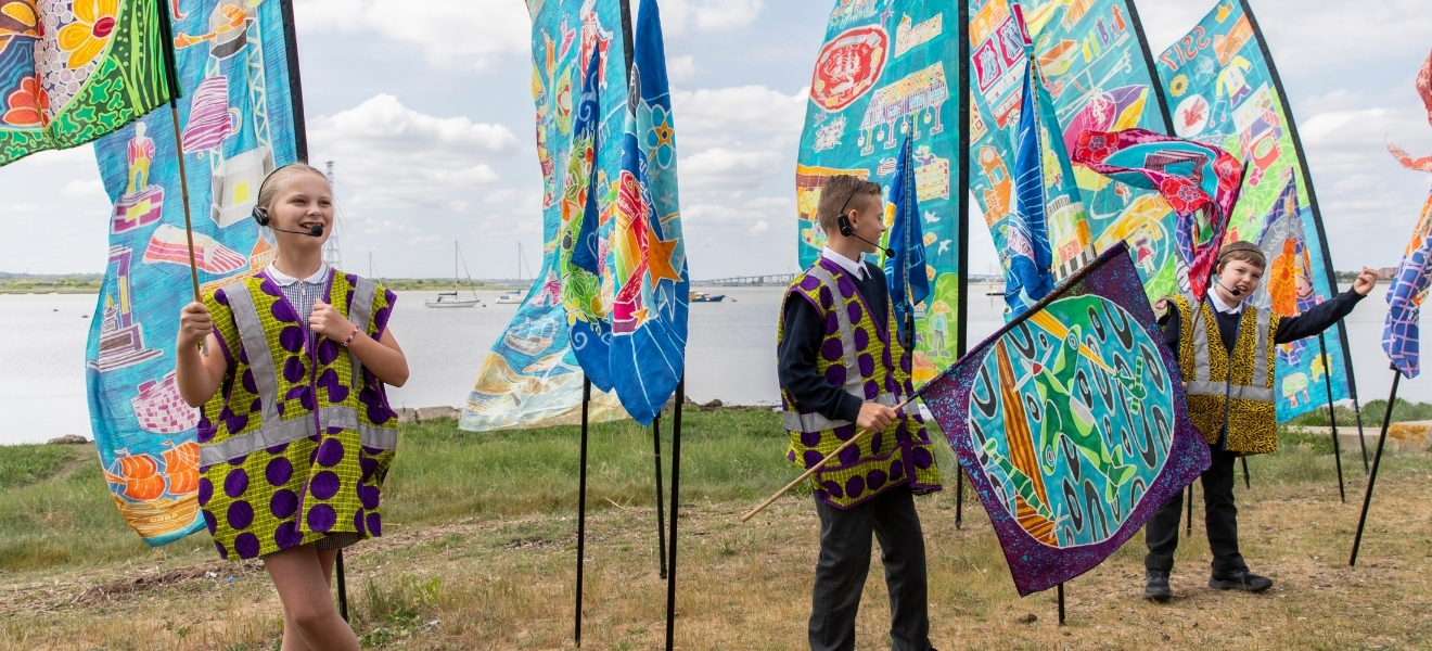T100 Young Ambassadors from East Tilbury Primary School with their coastcards, created as part of Our River, the 11th annual festival